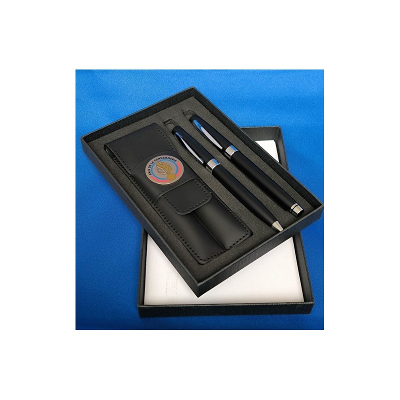 Parure Stylos HYPERION, stylo Bille et Roller avec Clips Brillants. Présenté dans son étui noir avec jeton Argent marqué Lazer du logo Amis de la Gendarmerie.